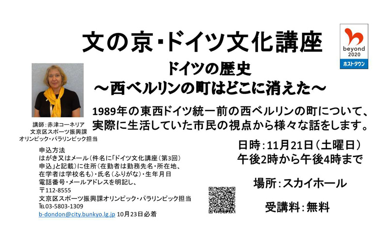 In November 2020, “German History: Where has West Berlin Gone?” was chosen as the theme of the 15th course. In response to participant requests, Ms. Cornelia Akatsu, who was born in Germany and works at the Bunkyo Ward Office, was invited to give a talk.