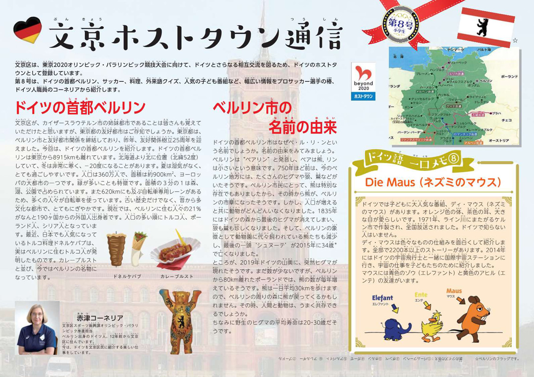 Der Bezirk Bunkyo bemüht sich auch auf andere Weise, unterschiedliche Generationen mit Informationen zu versorgen. An den Grund- und Mittelschulen werden ein Mal pro Semester deutsche Speisen als Schulessen serviert, wobei auch deutsche Mitarbeiter*innen dazu kommen. Mit der Mahlzeit wird das Tischset „Bunkyo Host Town Nachrichten“ mit den Rezepten der Speisen, Veranstaltungshinweisen für Kinder und Informationen zu Deutschland, wie Sprache, Sport usw., verteilt.