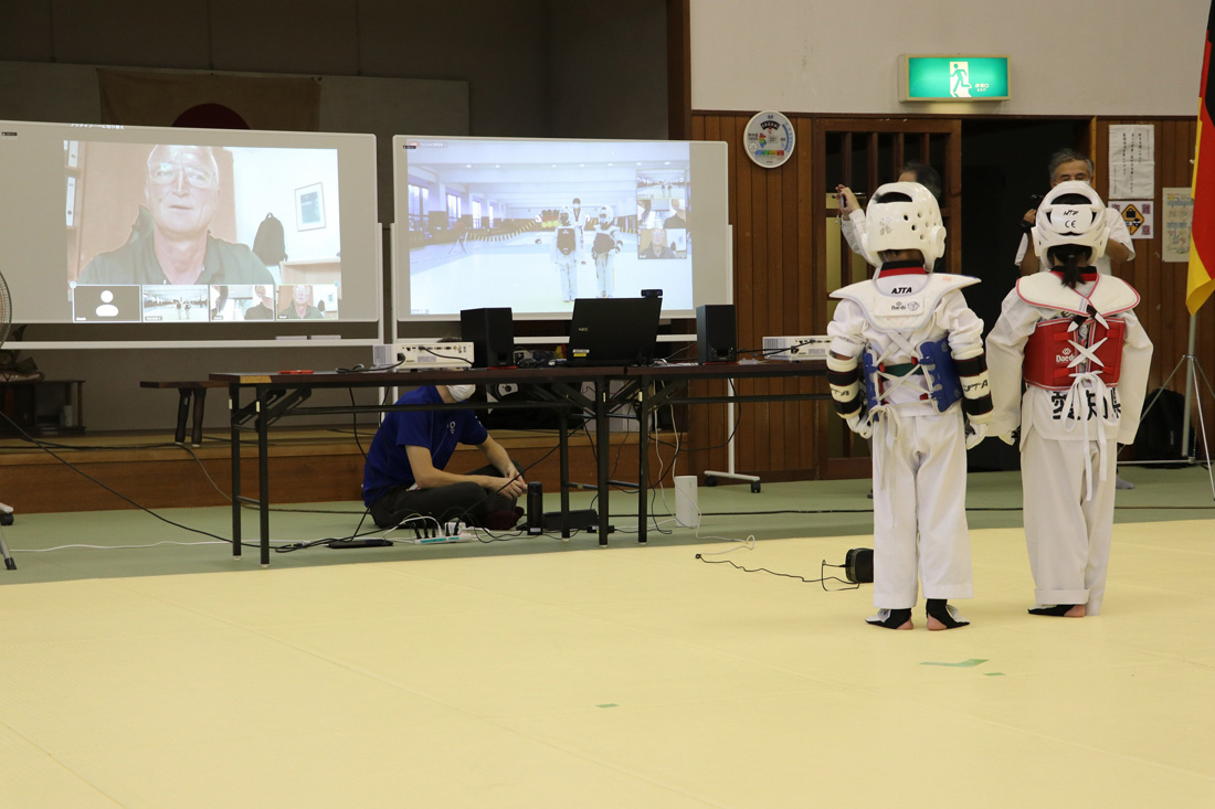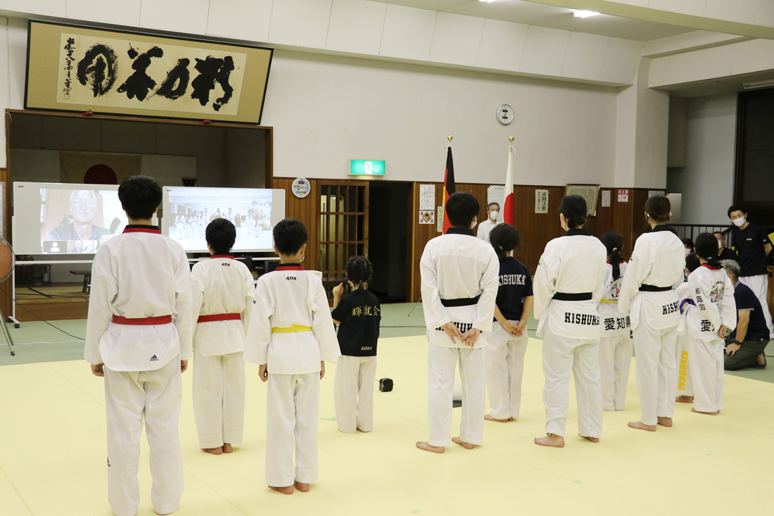 The Taekwondo Online Camp was held as a new form of exchange during the COVID-19 pandemic. During the camp, children received advice from the coach in Germany via live webcam. The 15 participants gathered an hour before the webcam session and did a thorough warm up. Each participant engaged in two spars, with the coach giving advice in between them. The participants took detailed notes while listening eagerly to the interpreted advice.